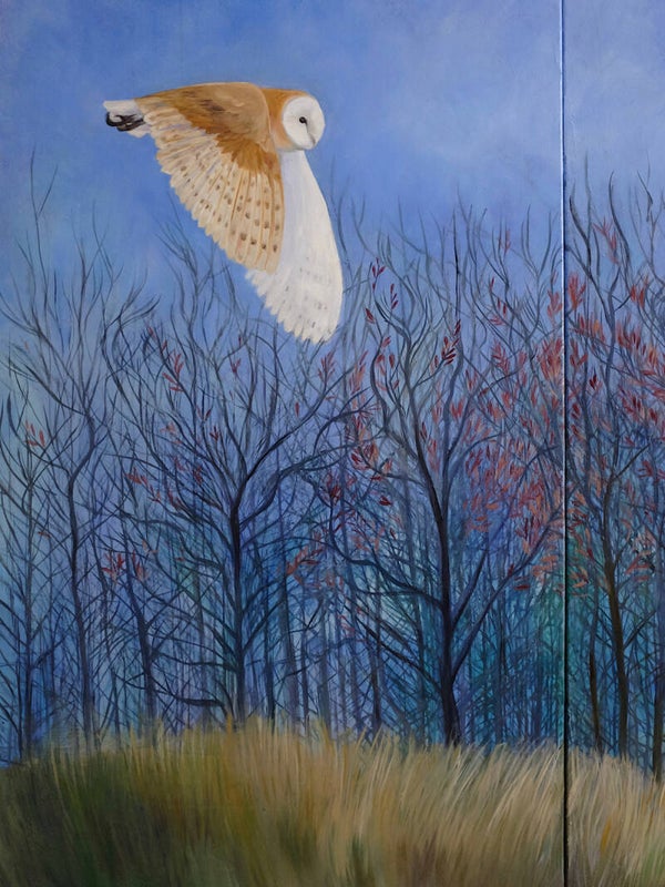 A diptych of a Barn owl hunting in the twilight autumnal fields. The painting is named after a Wendell Berry poem with the same title. The notion that it is only humans that experience a sense of existential dread or worry about their future, really struck a chord with me.